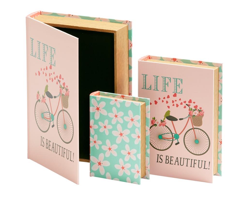 Forside » Møbler » Møbler med Tal & Tekst » Bakker & Skrin Bog skrin Life Is Beautiful sæt af 3 32x23x7cm Varenr: 2000604x Pris ved 1 Stk299,00 DKK Antal Køb Beskrivelse Spørg til varen Bog skrin - lyserødt rosa farvet sæt af 3 hvor 2 af bøgerne har en cykel på forsiden og teksten: "Life Is Beautiful" Mål: 32x23x7cm form
