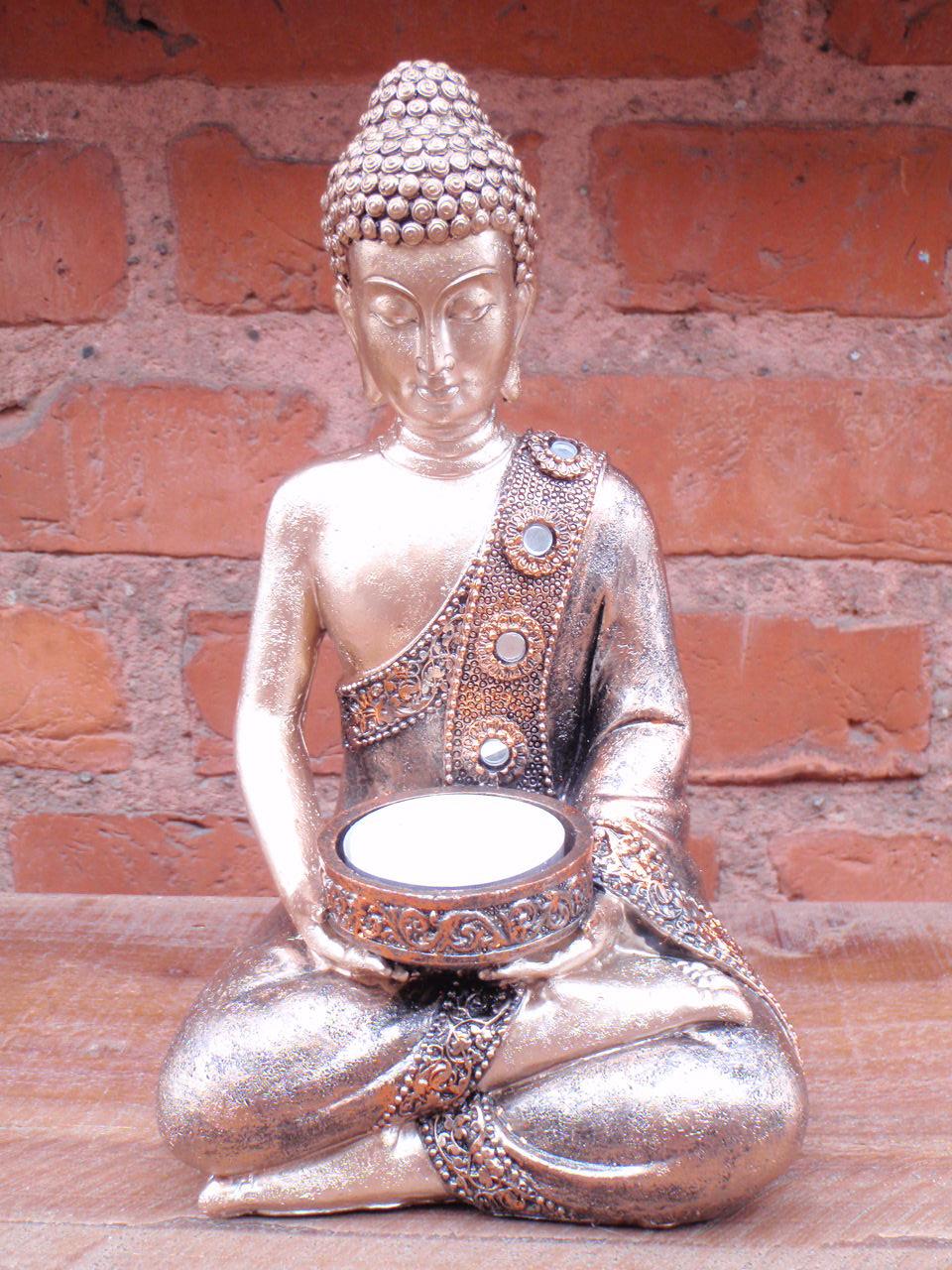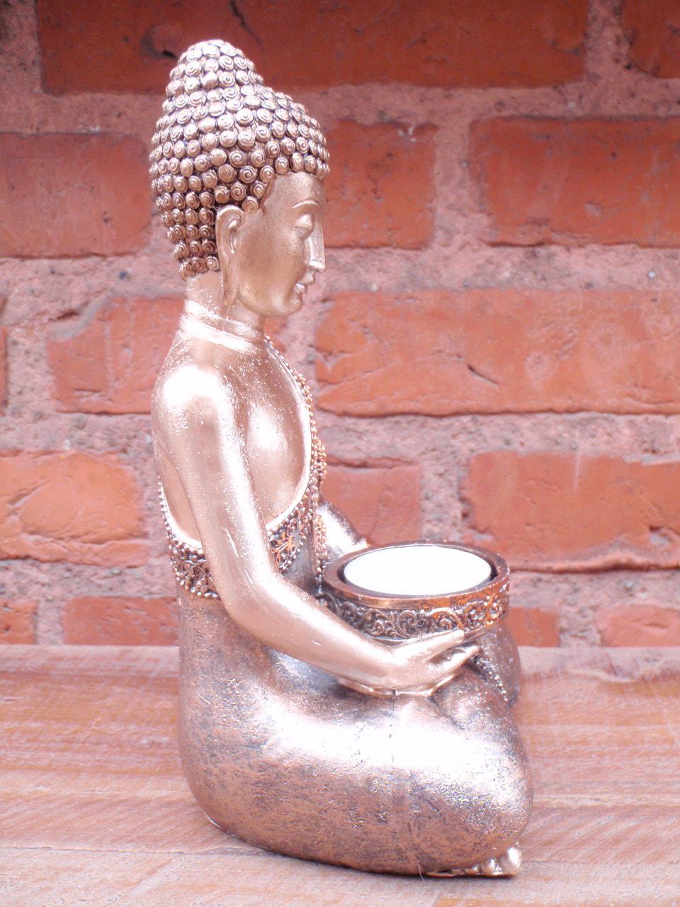 Forside » Figurer » Buddha figurer » Buddha i polyresin Buddha siddende guld/sølvfarvet h:19cm Varenr: BUD260 319,00 DKK Pris ved 1 Stk239,00 DKK Antal Køb Beskrivelse Spørg til varen Buddha figuren er støbt i 2 nuancer patineret og lys guldfarvet polyresin, som er et meget stærkt kunstmateriale og som på den mest fantastiske måde gengiver fine detaljer Mål: højde 19cm Se flere Buddha figurer i polyresin her form