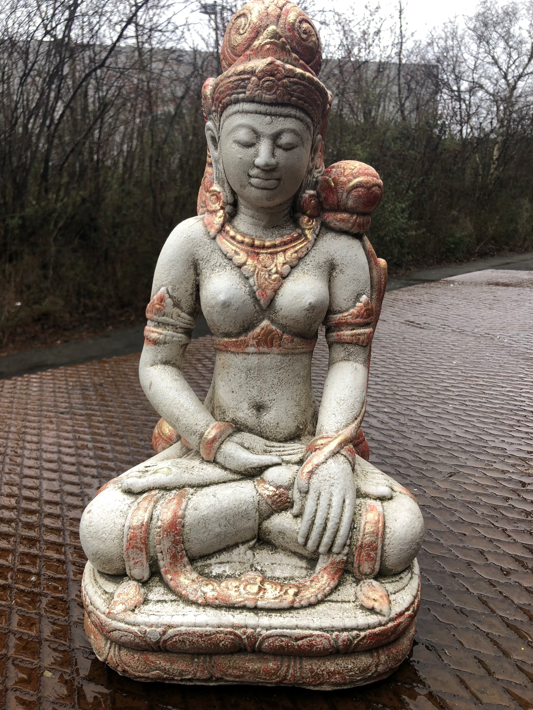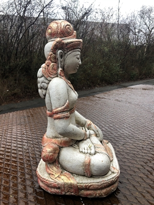 Buddha figur BUD064 er unikt håndlavet i støbt antik look sten på et lille værksted i Indonesien. Buddha figuren er virkelig flot udført i creme farve og siden dekoreret i gyldne nuancer. Buddha figuren er meget tung - ca. 15kg