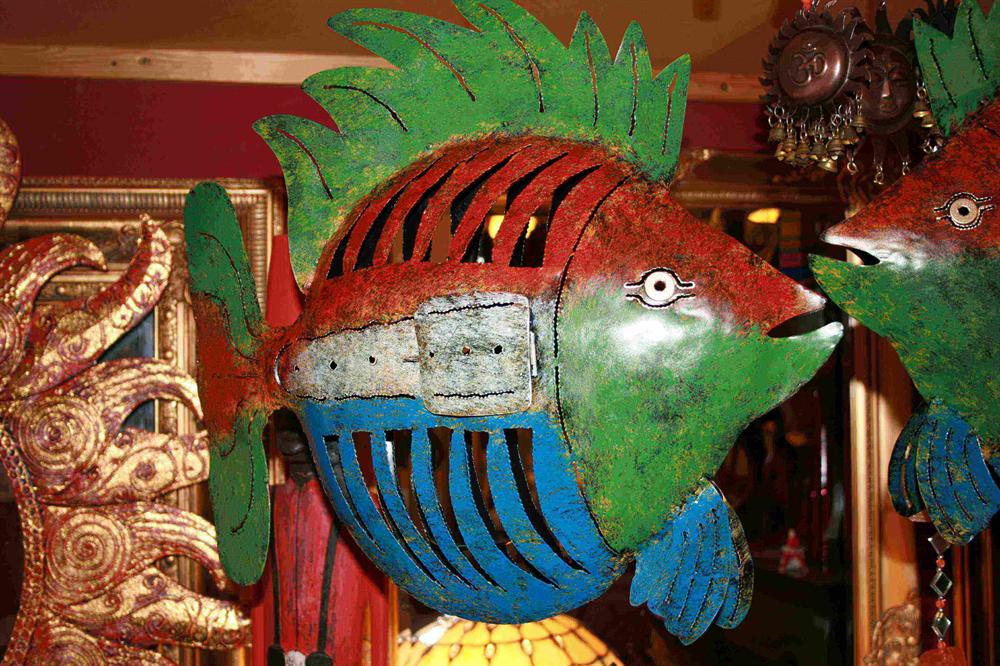 Forside » Figurer » Andre dyr » Fisk & Skildpadder Fisk metal flerfarvet 42x47cm Varenr: DYR104 Pris ved 1 Stk479,00 DKK Antal Køb Beskrivelse Spørg til varen Fiskene er håndlavet og håndmalet og er derfor alle forskellige i både udtryk og form Fisken kan have 1 fyrfadlys i maven form