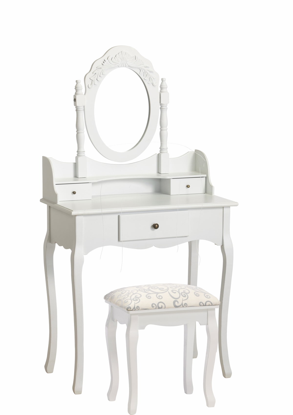 Prinsesse Sminkebord i hvidmalet MDF med buet ben, stort ovalt spejl som kan vippes, 3 skuffer og tilhørende skammel med lyslilla betræk. Mål: 75x140x40cm