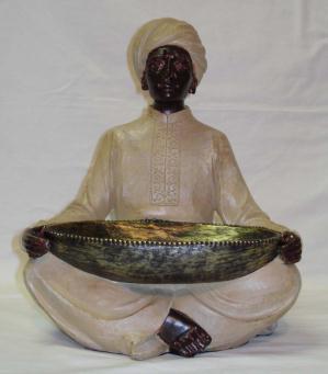 Indisk figur med turban og siddende med et stort aflangt fad til f.eks. nøgler eller nødder og andet guf. Figuren er rigtig godt fremstillet i polyresin i en cremefarvet antik look nuance. Polyresin er et kunststof der er stærkt og som man kan lave de fineste detaljer i