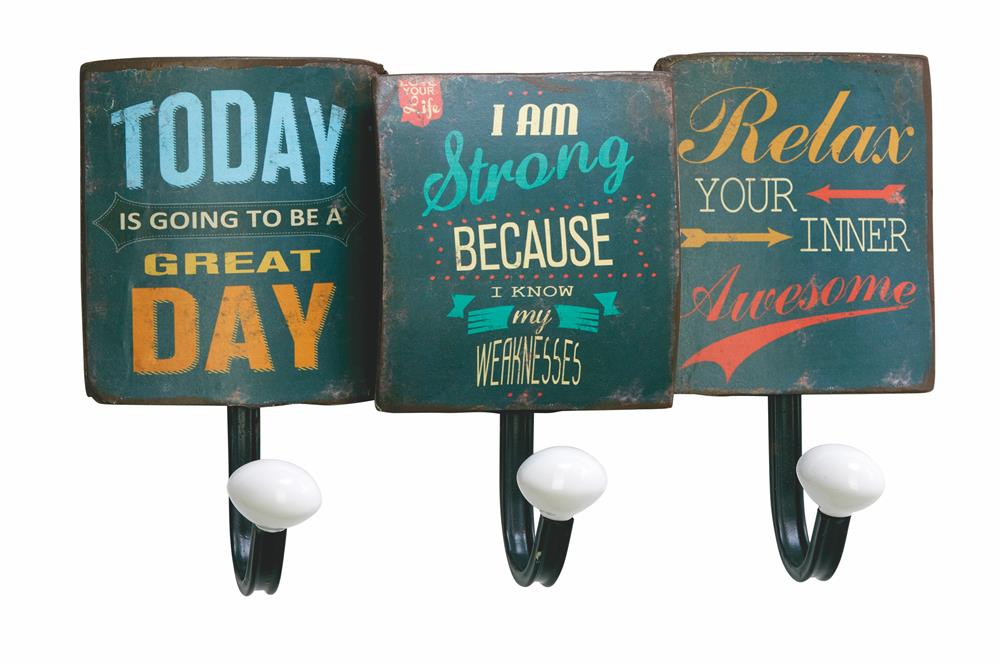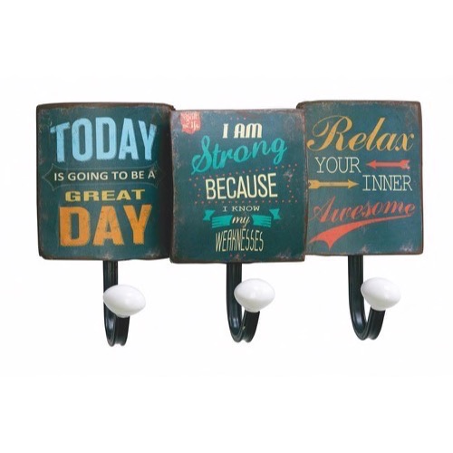 Forside » Møbler » Knagerækker » Knagerækker i metal Knagerække 3 kroge I Am Strong 34x22cm Varenr: 2012701 Pris ved 1 Stk139,00 DKK Antal Køb Beskrivelse Spørg til varen Knagerække med 3 kroge i antik patineret metal og med 3 svagt buet retro metal skilte med teksten: "Today Is Going To Be A Great Day - I Am Strong Because I Know My Weaknesses - Relax Your Inner Awesome" Mål: 34x22cm form Kunder købte også 89,00 DKK Metal skilt 20x48cm Let's Go Wild And... 89,00 DKK Metal skilt 27x27cm A Friend Is Someone Who...