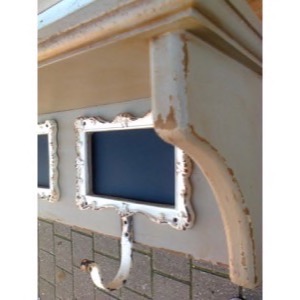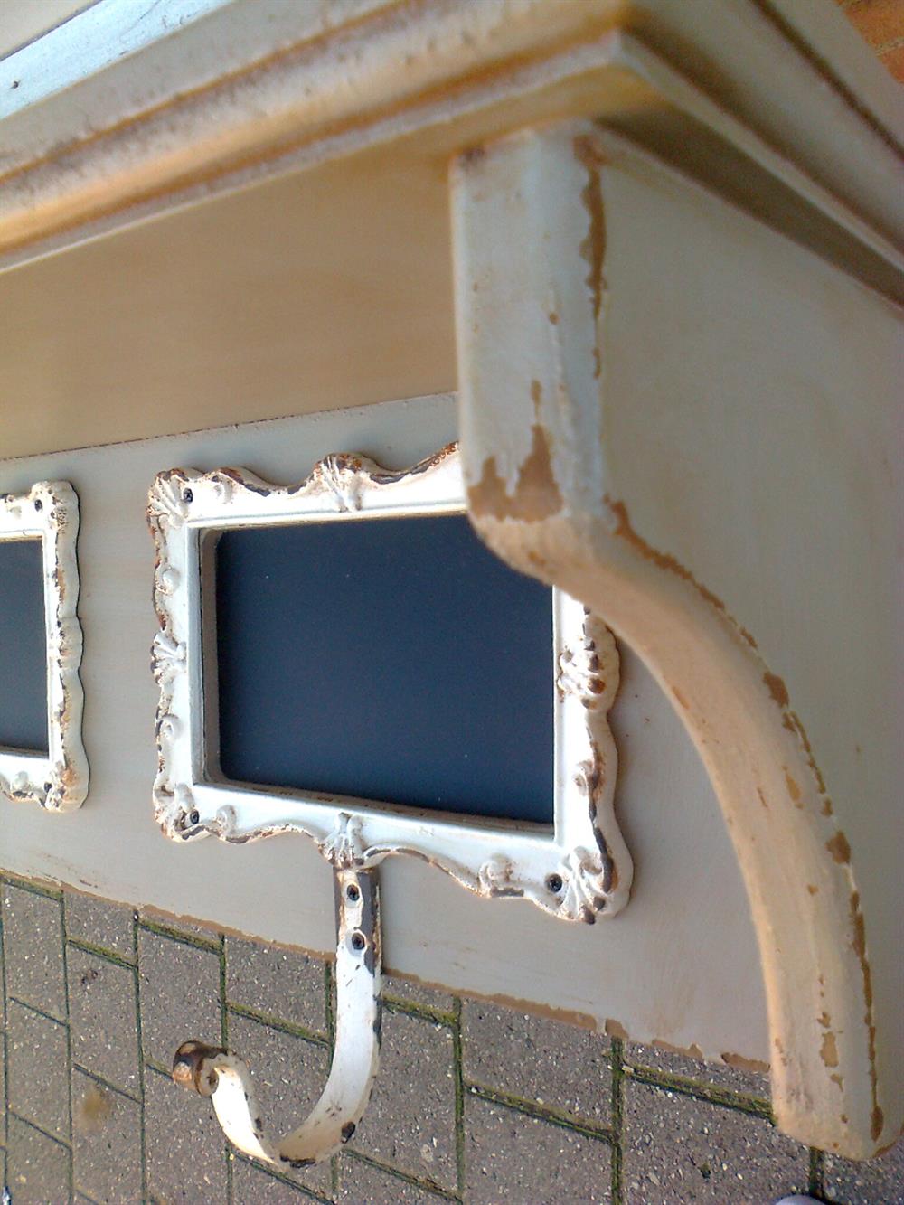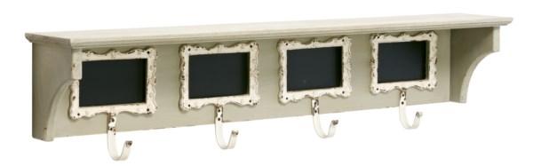 Kraftig udført military style knagerække / hylde udformet i træ med små kridt tavler og med stærk metalramme med krog under hver tavle. Extra god kvalitet og rigtig flot bemalet i antik look grågrøn slidt stil
