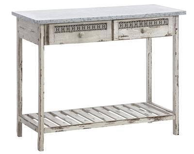 Konsolbord rustikt udført i den slidte stil og i patineret hvidgrå - bordpladen er belagt med galvaniseret metal som gør at konsolbordet er meget anvendeligt til f.eks. plantebord i drivhuset