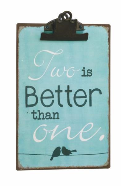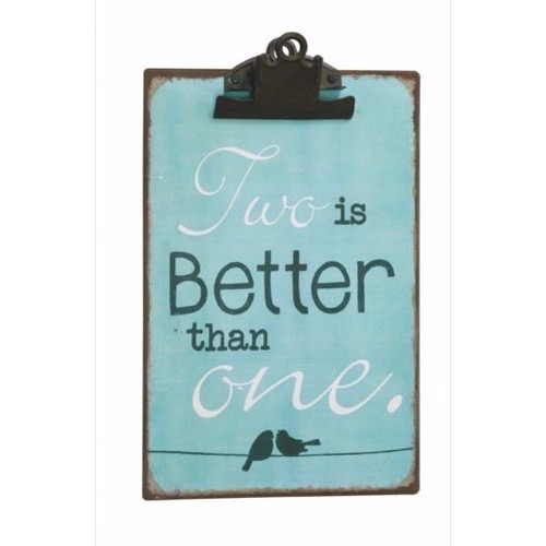 Forside » Skilte » Mindre metalskilte Metal Clipboard Two Is Better Than One 20x30cm Varenr: 2002101 Pris ved 1 Stk109,00 DKK Antal Køb Beskrivelse Spørg til varen Metal Clipboard med teksten: "Two Is Better Than One" Mål: 20x30x4cm Se flere Clipboards og små metal skilte her form
