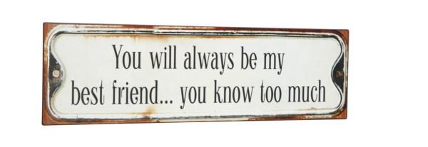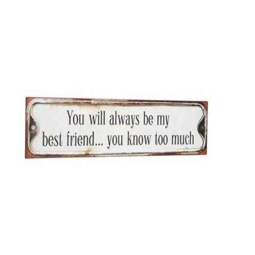 Forside » Skilte » Mindre metalskilte Metal skilt 51x15cm You Will Always... Varenr: 1385501 109,00 DKK Pris ved 1 Stk79,00 DKK Antal Køb Beskrivelse Spørg til varen OBS!!! Skiltet er omvendt i farverne - dvs. mørk baggrund og lys tekst Metal skilt med teksten: You Will Always Be My Best Friend...You Know Too Much Mål: 51x15cm form Kunder købte også 49,00 DKK Metal Skilt A Man Is Not Complete Until...31x13cm 89,00 DKK Metal skilt 27x35cm Words To Live By 18,00 DKK Magnet 5x7cm Life Moves Pretty Fast 18,00 DKK Magnet 7x5cm Take Me Shopping And I´m Yours