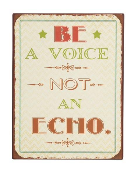 Forside » Skilte » Medium metalskilte Metal skilt Be A Voice - Not An Echo 26x35cm Varenr: 1395801 Pris ved 1 Stk89,00 DKK Antal Køb Beskrivelse Spørg til varen Retro metal skilt med teksten: "Be A Voice - Not An Echo" Mål: 26x35cm form Kunder købte også 89,00 DKK Metal skilt 26x35cm Be With Someone Who...