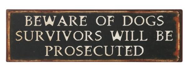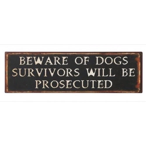 Forside » Skilte » Mindre metalskilte Metal skilt Beware Of Dogs 51x15cm Varenr: 1396901 99,00 DKK Pris ved 1 Stk79,00 DKK Antal Køb Beskrivelse Spørg til varen Metal skilt med teksten: Beware Of Dogs - Survivors Will Be Prosecuted Mål: 51x15cm form