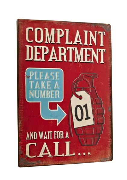 Forside » Skilte » Medium metalskilte Metal skilt Complaint Department 26x35cm Varenr: 1401001 Pris ved 1 Stk99,00 DKK Antal Køb Beskrivelse Spørg til varen Bogstaver er præget i metallet Metal skilt med tekst: "Complaint Department - Please Take A Number And Wait For A Call" Mål: 26x35 form