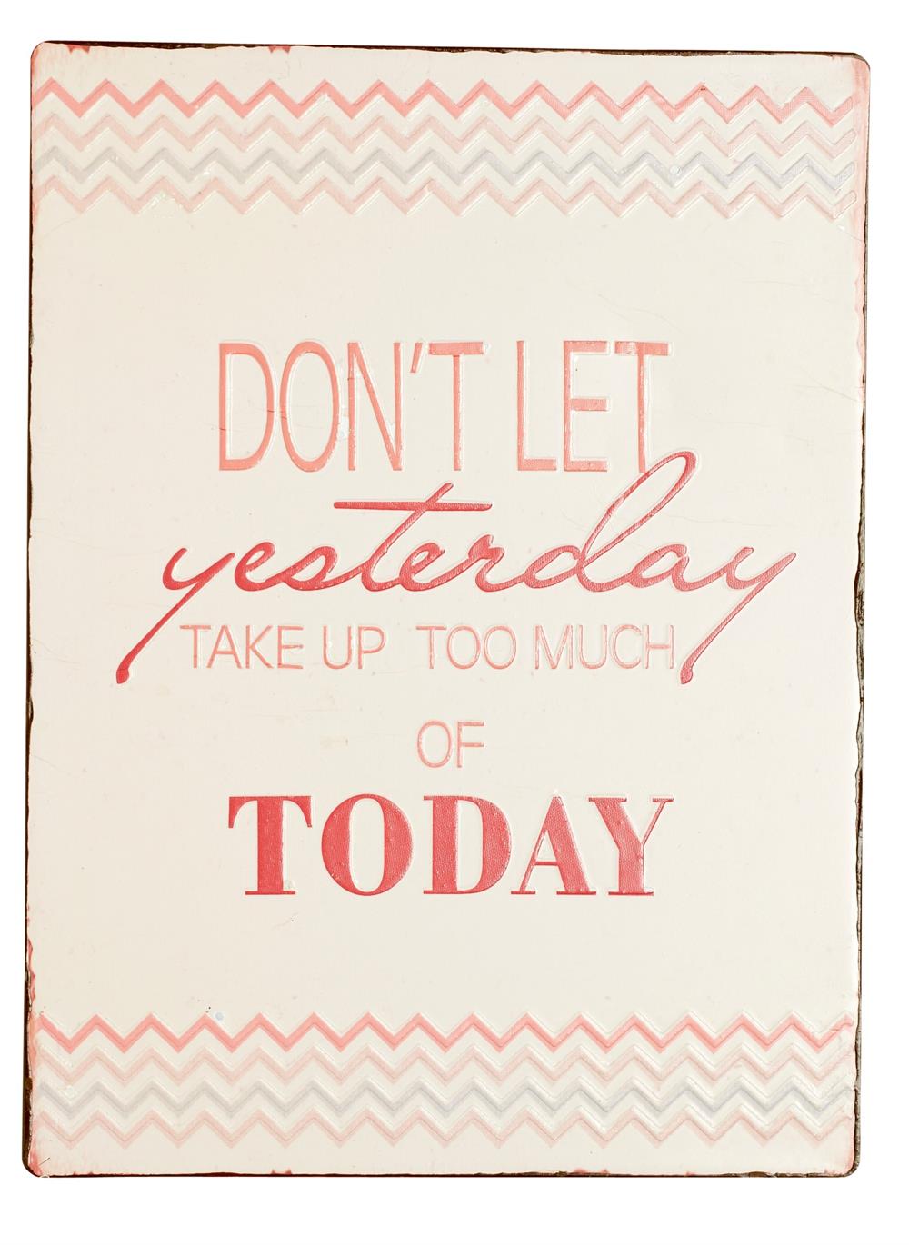 Forside » Skilte » Medium metalskilte Metal skilt Don't Let Yesterday Take Up...26x35cm Varenr: 1402501 Pris ved 1 Stk99,00 DKK Antal Køb Beskrivelse Spørg til varen Retro metal skilt med teksten: "Don't Let Yesterday Take Up Too Much Of Today" Mål: 26x35cm Bogstaverne er fremhævet i skiltet Se flere Medium Metal skilte her form