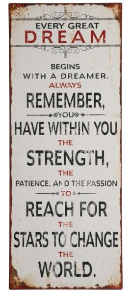 Forside » Skilte » Større metalskilte Metal skilt Every Great Dream Begins... 31x76cm Varenr: 1389401 Pris ved 1 Stk149,00 DKK Antal Køb Beskrivelse Spørg til varen Retro metal skilt med teksten: "Every Great Dream Begins With A Dreamer - Always Remember You Have Within You The Straingth, The Patience And The Passion To Reach For The Stars To Change The World" Mål: 31x76cm form Kunder købte også 139,00 DKK Metal skilt If Somebody Believes...31x76cm 109,00 DKK Metal skilt There Is Always Something...31x39cm 99,00 DKK Metal skilt Laundry Rules 26x35cm 129,00 DKK Træ skilt Bathroom Rules 40x40cm