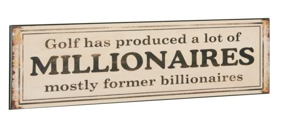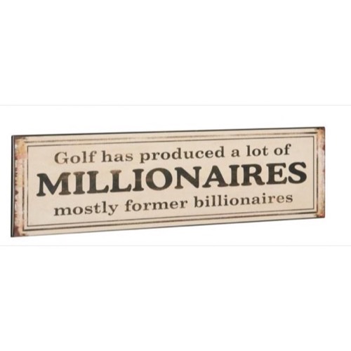 Forside » Skilte » Mindre metalskilte Metal Skilt Golf Has Produced A Lot...40x10cm Varenr: 1542801 Pris ved 1 Stk49,00 DKK Antal Køb Beskrivelse Spørg til varen Retro metal skilt med teksten: "Golf Has Produced A Lof Of MILLIONAIRES - Mostly Former Billionaires Mål: 40x10cm form