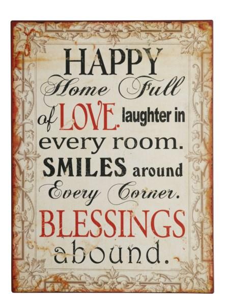 Forside » Skilte » Større metalskilte Metal skilt Happy Home Full Of Love 37x50cm Varenr: 1389701 Pris ved 1 Stk129,00 DKK Antal Køb Beskrivelse Spørg til varen Retro metal skilt med teksten: "Happy Home Full Of Love Laughter In Every Room Smiles Around Every Corner Blessings Abound: Mål: 37x50cm form