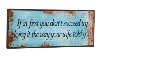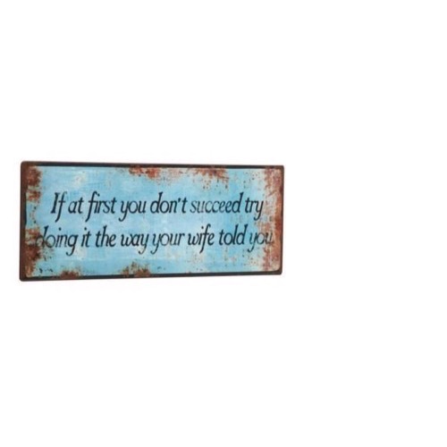 Forside » Skilte » Mindre metalskilte Metal skilt If At First You Don't Succesed... Varenr: 1381001 Pris ved 1 Stk49,00 DKK Antal Køb Beskrivelse Spørg til varen Lyseblåt metal skilt med antydningen af rust og teksten: "If At First You Don't Succeed Try Doing It The Way Your Wife Told You" Mål: 31x13cm Se flere Små metal skilte her form Kunder købte også 79,00 DKK Metal skilt It Doesn't Matter Where...51x15cm