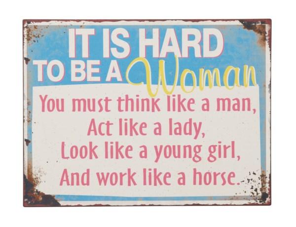 Forside » Skilte » Medium metalskilte Metal skilt It Is Hard To Be A Woman...35x26cm Varenr: 1395101 Pris ved 1 Stk89,00 DKK Antal Køb Beskrivelse Spørg til varen Metal skilt med teksten: "It Is Hard To Be A Woman - You Must Think Like A Man, Act Like A Lady, Look Like A Young Girl And Work Like A Horse" Mål: 35x26cm form
