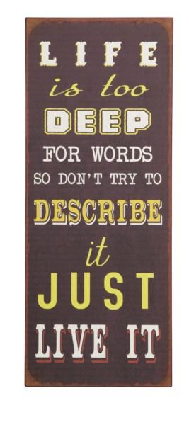 Forside » Skilte » Større metalskilte Metal skilt Life Is To Deep For...31x76cm Varenr: 1392201 Pris ved 1 Stk149,00 DKK Antal Køb Beskrivelse Spørg til varen Metal skilt med teksten: "Life Is To Deep For Words So Don't Try To Describe It Just Live It" Mål: 31x76cm form