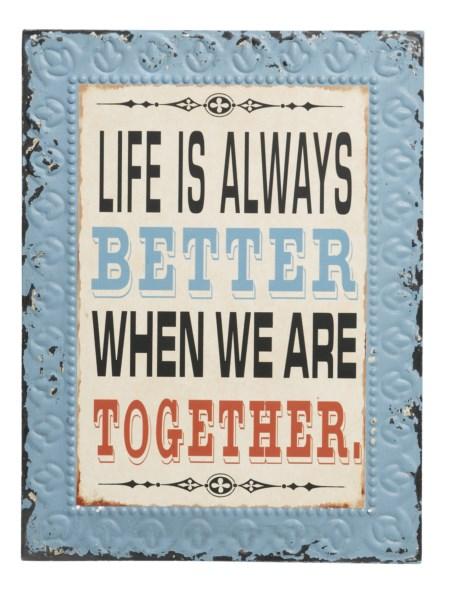 Forside » Skilte » Større metalskilte Metal skilt Life Is Always Better...33x43cm Varenr: 1394601 Pris ved 1 Stk139,00 DKK Antal Køb Beskrivelse Spørg til varen Mønster er præget i metallet Metal skilt med teksten: "Life Is Always Better When We Are Together" Mål: 33x43cm form Kunder købte også 139,00 DKK Metal skilt Live For Today...43x33cm 139,00 DKK Metal skilt Love Is The Heart Of Our...33x43cm 89,00 DKK Metal skilt I Believe There Is Always...26x35cm