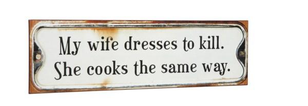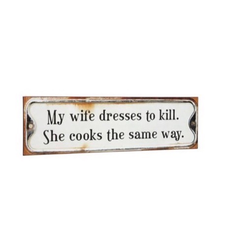 Forside » Skilte » Mindre metalskilte Metal skilt My Wife Dresses To Kill...51x15cm Varenr: 1385601 109,00 DKK Pris ved 1 Stk79,00 DKK Antal Køb Beskrivelse Spørg til varen Retro metal skilt med teksten: My Wife Dresses To Kill - She Cooks The Same Way Mål: 51x15cm form Kunder købte også 89,00 DKK Metal skilt 20x48cm What I Love Most...