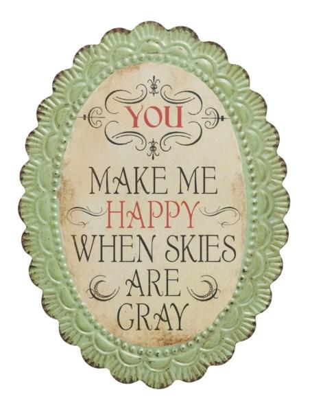 Forside » Skilte » Større metalskilte Metal skilt You Make Me Happy... 34x46cm Varenr: 1394301 Pris ved 1 Stk119,00 DKK Antal Køb Beskrivelse Spørg til varen Mønster er præget i metallet Ovalt metal skilt med teksten: "You Make Me Happy When Skies Are Grey" Mål: 34x46cm form
