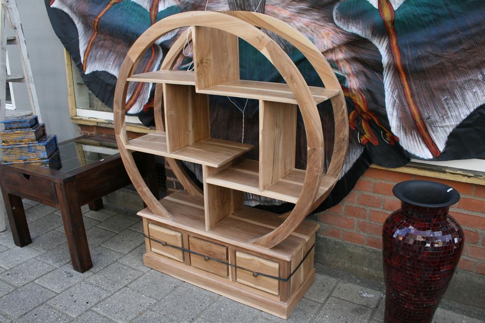 Forside » Møbler » Teak & lyst træ » Skabe & Reoler Rund reol massiv teak 100x120x30cm Varenr: TEAK012 Pris ved 1 Stk3.899,00 DKK Antal Køb Beskrivelse Spørg til varen Mål: B: 100cm H: 120cm D: 30cm Enestående og helt unik reol som kun findes hos os. Reolen er udført i whitewashed massiv teak og leveret i et stykke. Reolen er kraftigt udført og er ligeså flot på bagsiden som på forsiden. Skufferne kører fint i riller og har smukke patinerede messing knopper Reolen fås også i en større udgave 130x140x30cm pris kr. 4799,- Begge reoler fås også i farverne Natur TEAK003 og Dark TEAK006 form