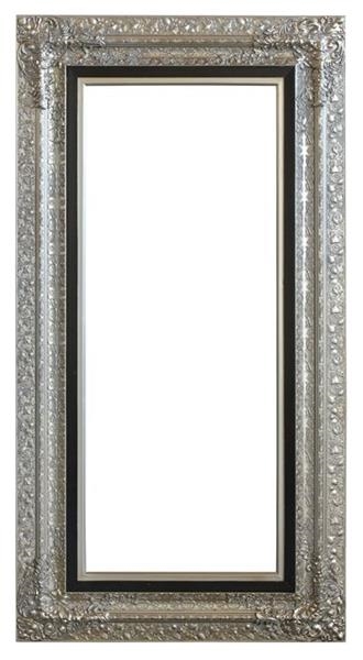Facetslebet stort sølvspejl i barok stil med utrolig elegant patineret og bred træramme i en fin sølv nuance og strammet op med en sort streg. Et spejl som dette kræver en stor og åben væg så det rigtig kan komme til udtryk. Mange vil ved første øjekast tro at dette er et originalt gammelt spejl