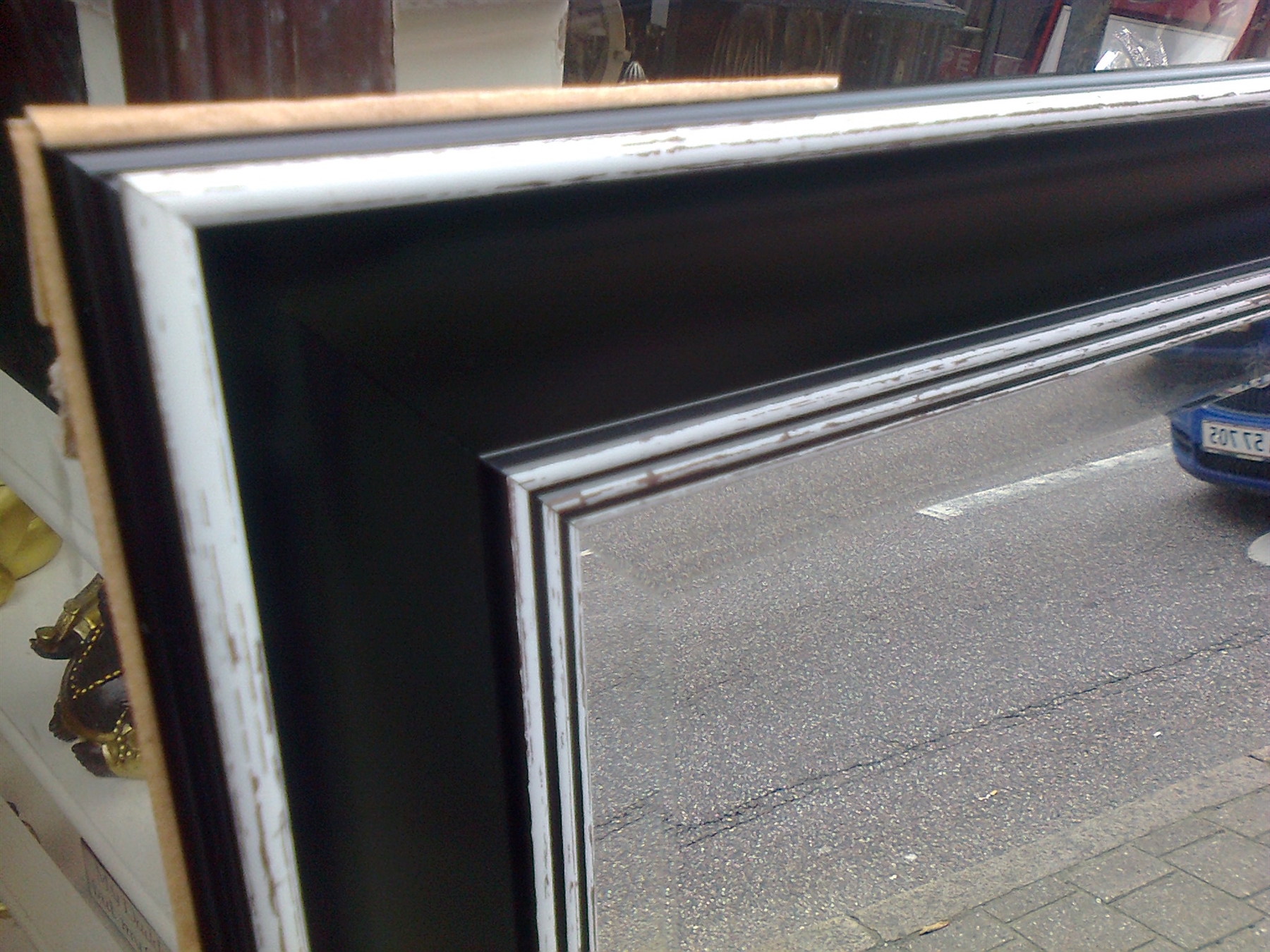 Klassisk spejl 5161 i facetslebet glas med enkel mat sort ramme med patineret slidt hvidt underlag der elegant fremhæver profilet