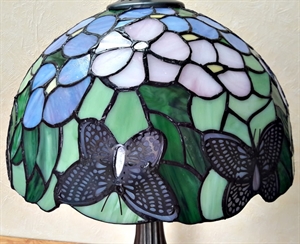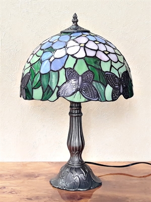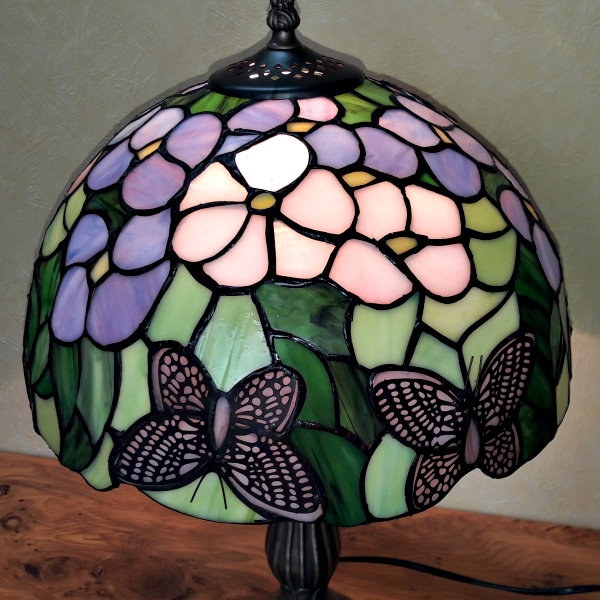 Vidunderlig Tiffany bordlampe med fine lyserøde og lilla blomster med grønne blade og flere lyserøde sommefugle nederst i kanten af skærmen