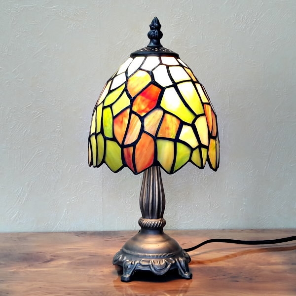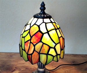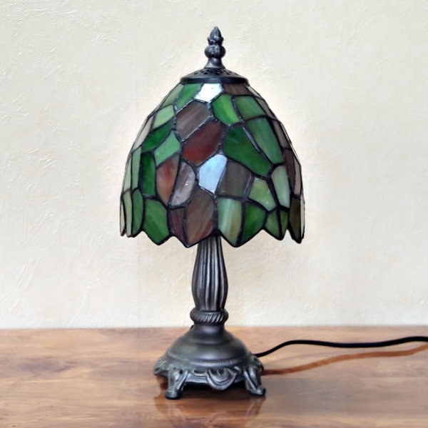 Tiffany bordlampe med grønlig skærm og et strejf af røde og grønne nuancer
