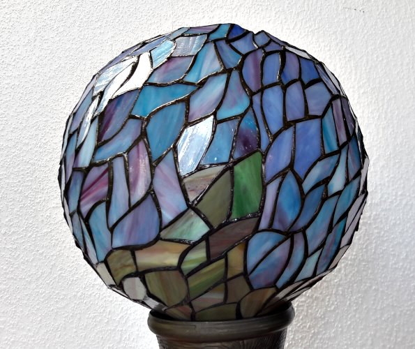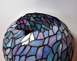 Fantastisk Tiffany bord- eller gulvlampe med rund åben skærm og en fod der kan minde om den olympiske fakkel eller VM-trofæet i fodbold. Farverne i denne helt unikke Tiffany lampe er også ganske specielle idet glasstykker er blålige og ændrer sig til det mere brun lilla som det tydeligt ses på billederne