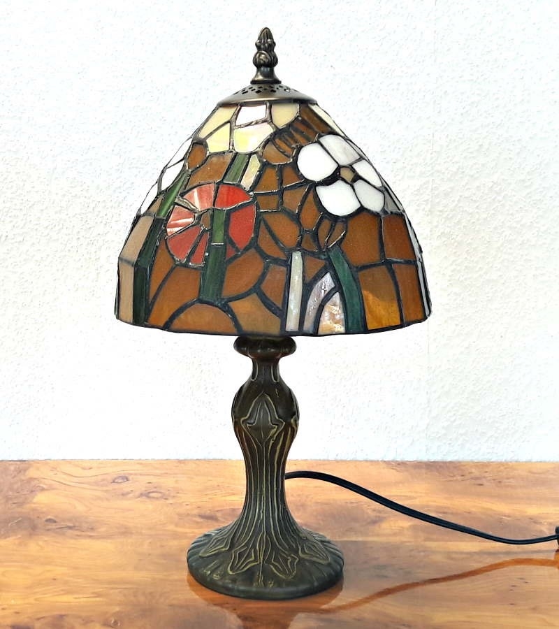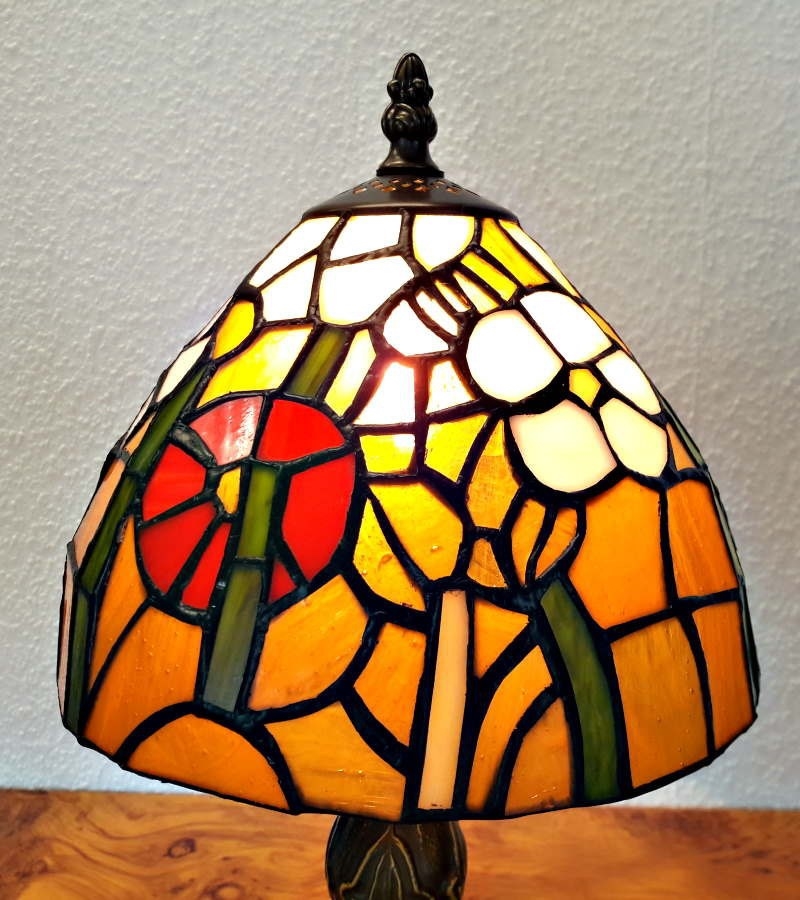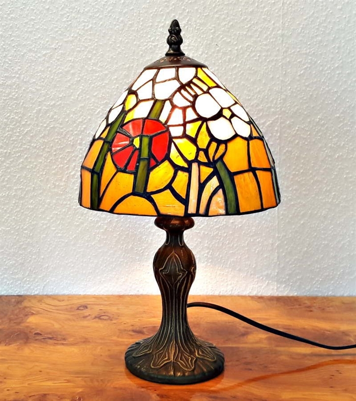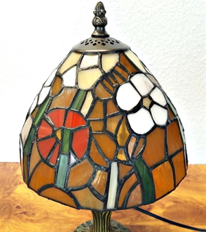 Tiffany bordlampe med mørk orange bund og med hvide og røde blomster og grønt. En flot og meget varm Tiffany lampe