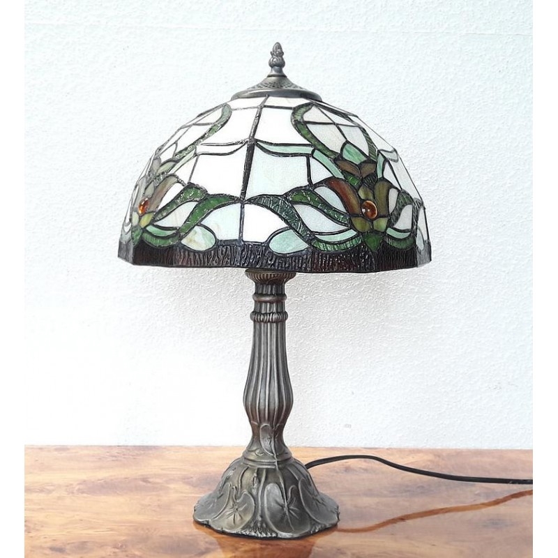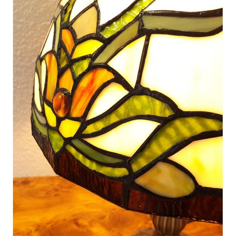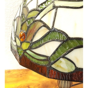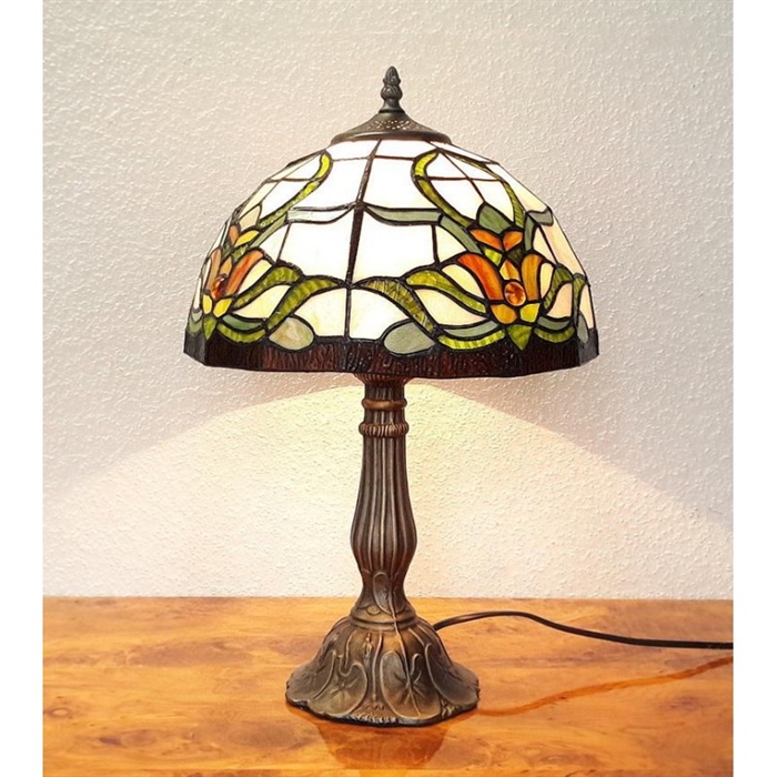 Tiffany bordlampe med hvid bund og varme farver af grønne og vissengrønne nuancer samt lidt orange med en stor orange perler