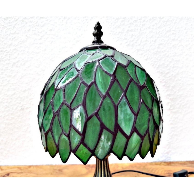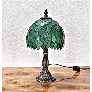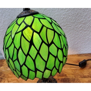 Tiffany bordlampe med en en græsgrøn skærm der kan minde om palmetræet fra Peter Pedal bøgerne