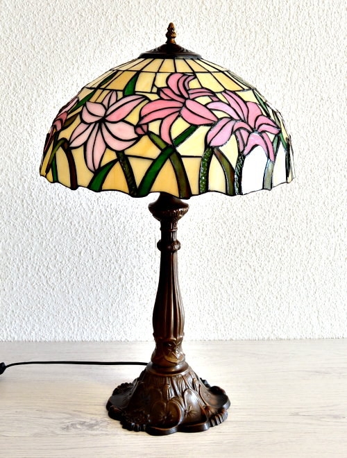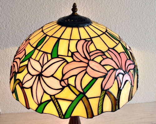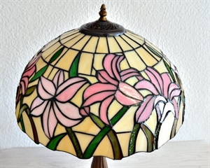 Store elegante liljer i lyserøde pastelfarver med lysegrønne blade giver denne Tiffany lampes skærm et særligt og smuk udtryk