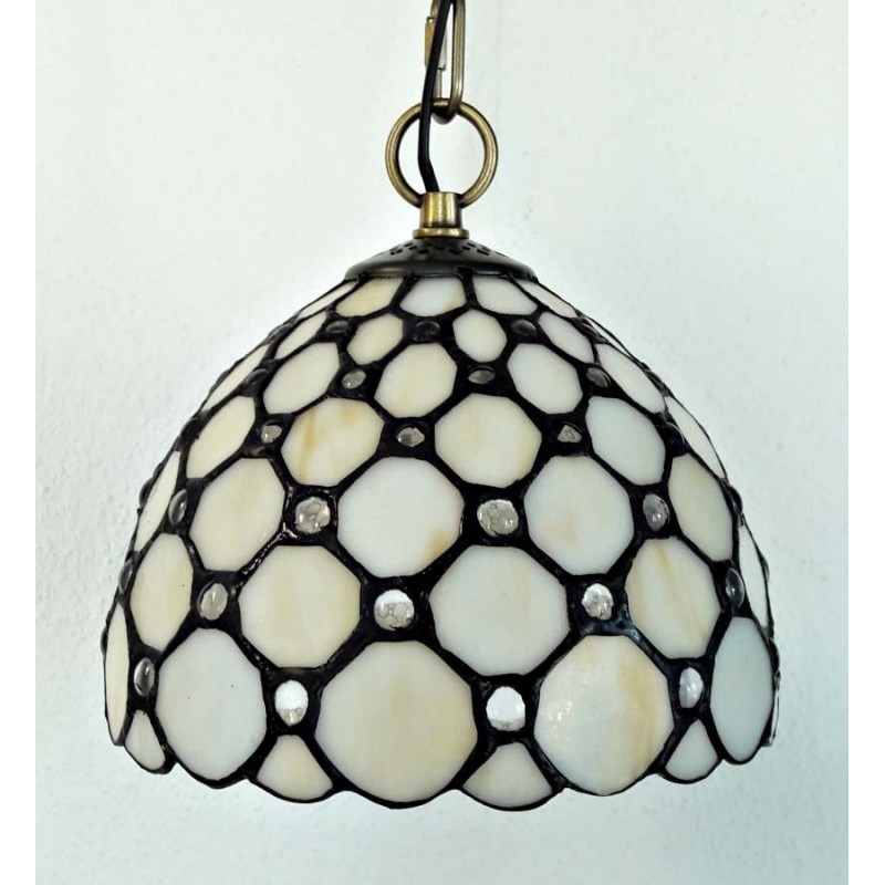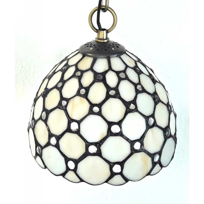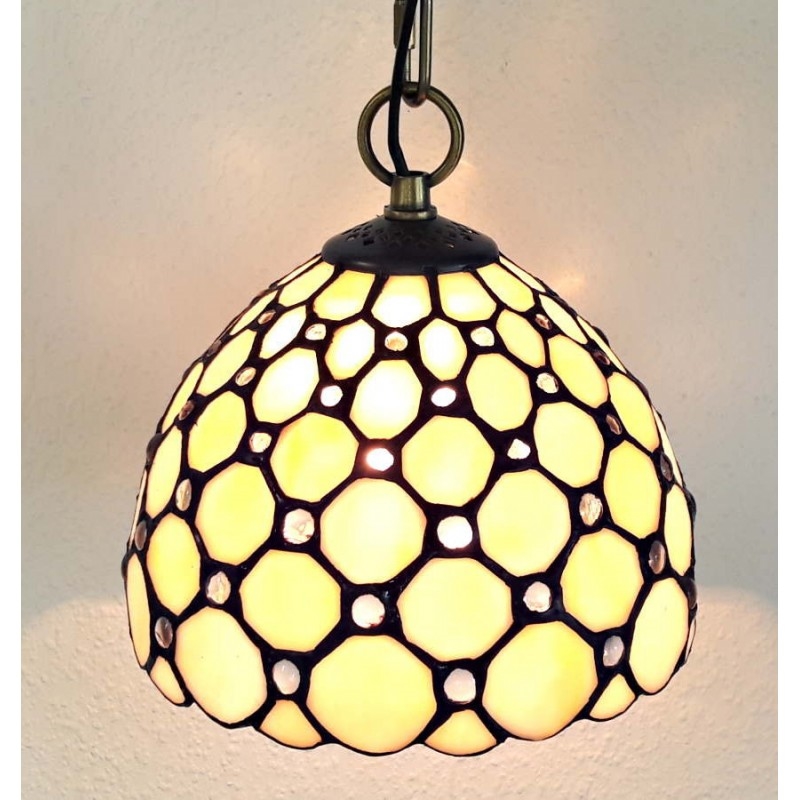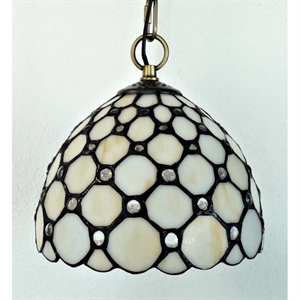 Klassisk Tiffany hængelampe i rund form med enkel hvid gylden bund og klare perler