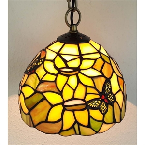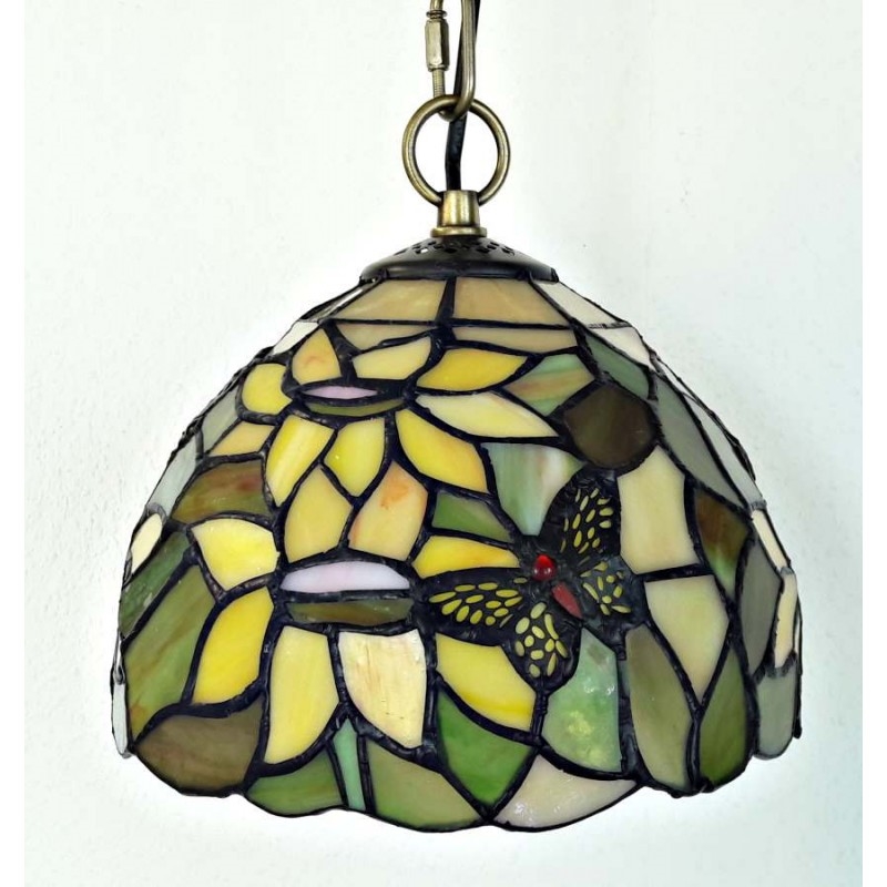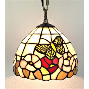 Tiffany hængelampe med varme farver af gule og grønne nuancer og en lille rød sommerfugl i skærmen