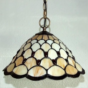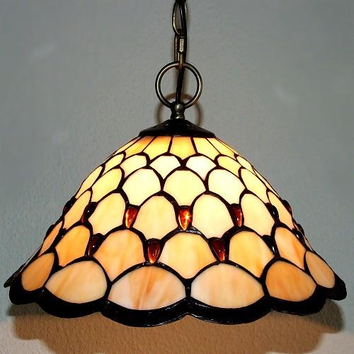 Tiffany hængelampe med en rigtig flot varm og gylden bundfarve i et fiskeskæl mønster og med brune perler imellem felterne og med en brun kant forneden