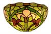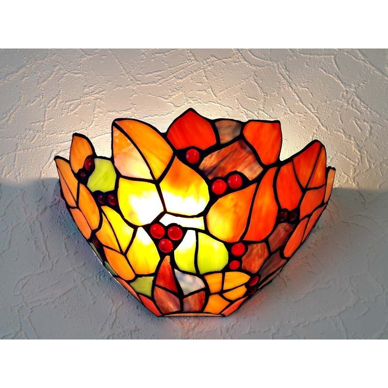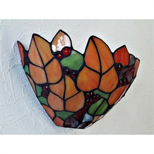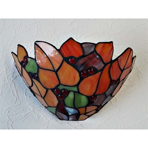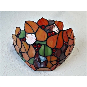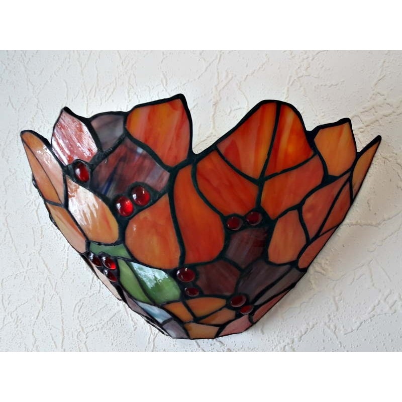 Tiffany væglampe i mørke orange og grønne nuancer med røde sten og en ujævn kant foroven