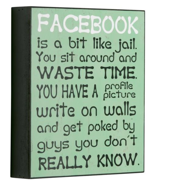 Forside » Skilte » Træ skilte Træ skilt Facebook Is A Bit Like...21x25x5cm Varenr: 1702701 Pris ved 1 Stk109,00 DKK Antal Køb Beskrivelse Spørg til varen Flot grønt træ skilt med Hvid overskrift og sort tekst: Facebook Is A Bit Like Jail. You Sit Around And Waste Time. You Have A Profile Picture Write On Walls And Get Poked By Guys You Don´t Really Know Mål: 21x25x5cm Se flere Træ skilte her form