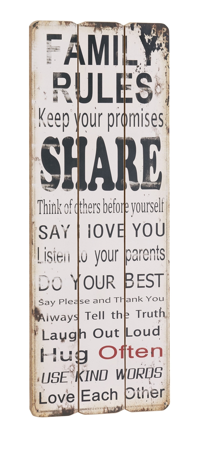 Forside » Skilte » Træ skilte Træ skilt Family Rules 31x76cm Varenr: 1502801 249,00 DKK Pris ved 1 Stk169,00 DKK Antal Køb Beskrivelse Spørg til varen Antik look træ skilt sat sammen af 3 stykker træ med overskriften Family Rules og nedenunder følger 12 gode råd. De 41 af ordene er i sort og bare eet ord er i rødt Mål: 31x76cm Se flere Træskilte her form Kunder købte også 18,00 DKK Magnet 5x7cm Let´s Eat