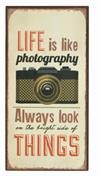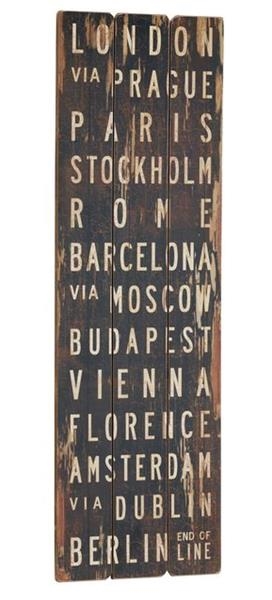 Stort retro træ skilt i brunsorte og cremefarvet nuancer og en stribe af byer nævnes på noget af en rejse: