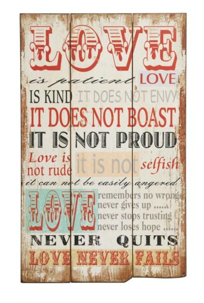 Forside » Skilte » Træ skilte Træ skilt Love Is Patient - Love Is Kind 40x65cm Varenr: 1388501 Pris ved 1 Stk189,00 DKK Antal Køb Beskrivelse Spørg til varen Retro træ skilt med teksten: Love Is Patient - Love Is Kind - It Does Not Envy - It Does Not Boast - It Is Not Proud - Love Is Not Rude - It Is Not Selfish..." Mål: 40x65cm Se flere Træ Skilte her form