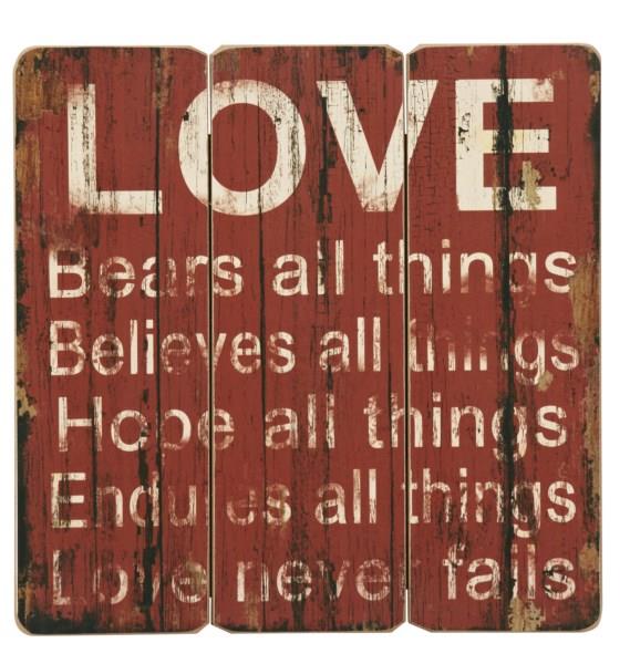 Forside » Skilte » Træ skilte Træ skilt Love Bears All Things... 40x40cm Varenr: 1502101 Pris ved 1 Stk149,00 DKK Antal Køb Beskrivelse Spørg til varen Retro rødt træ skilt med teksten: "Love Bears All Things - Believes All Things - Hope All Things - Endure All Things - Love Never Fails" Mål: 40x40cm form