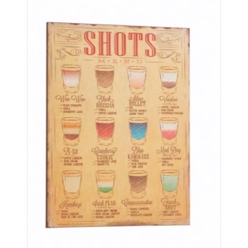 Forside » Skilte » Træ skilte Træ skilt Shots Menu 30x40cm Varenr: 1509401 Pris ved 1 Stk119,00 DKK Antal Køb Beskrivelse Spørg til varen Antik look træ skilt med teksten: Shots Menu - nedenunder er en farverig oversigt af 12 forskellige klassiske drinks typer og med beskrivelse af hvad hver enkelt indeholder Mål: 30x40cm Se flere Træ skilte her form