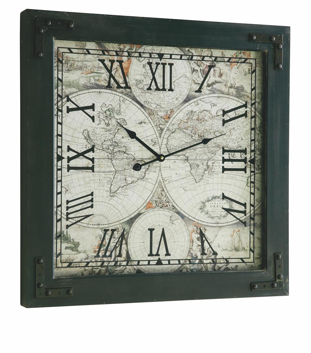 Ur 21009 Kvadratisk massiv træ ramme med tydelige vinkler med nagler i hjørnerne som giver uret et nærmest nautisk udtryk som bliver understreget af et flot gammeldags geografisk kort som urskive