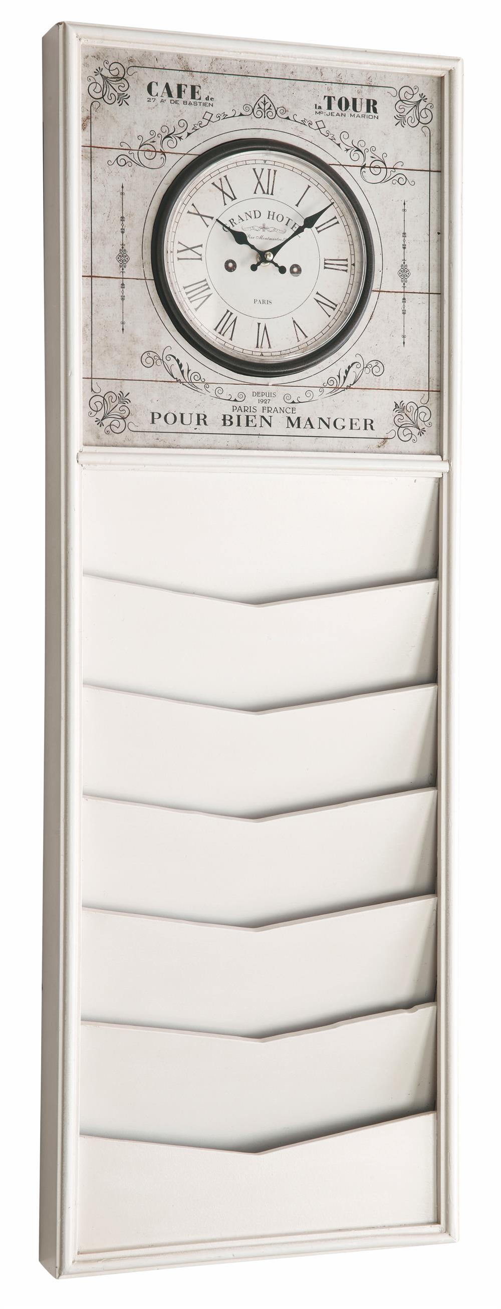 Rektangulært cremefarvet træ ur udformet som en bladholder i den gammeldags stil. Uret har 6 skrå revner til f.eks. ugeblade. Uret har en flot patineret urskive med romertal og teksten: " Deputs 1928 - Cafe de la Tour - pour bien manger - Paris, France"