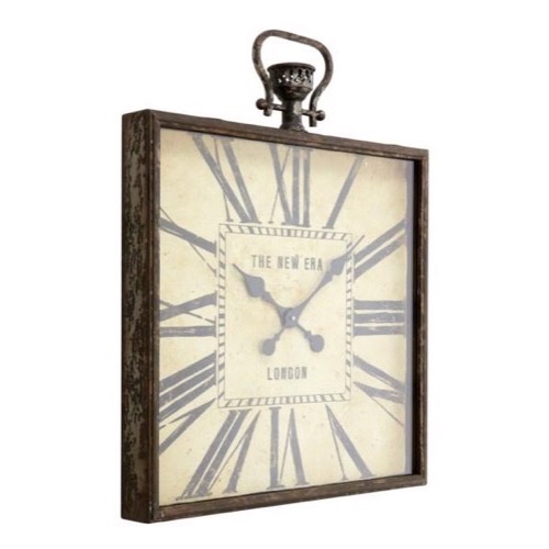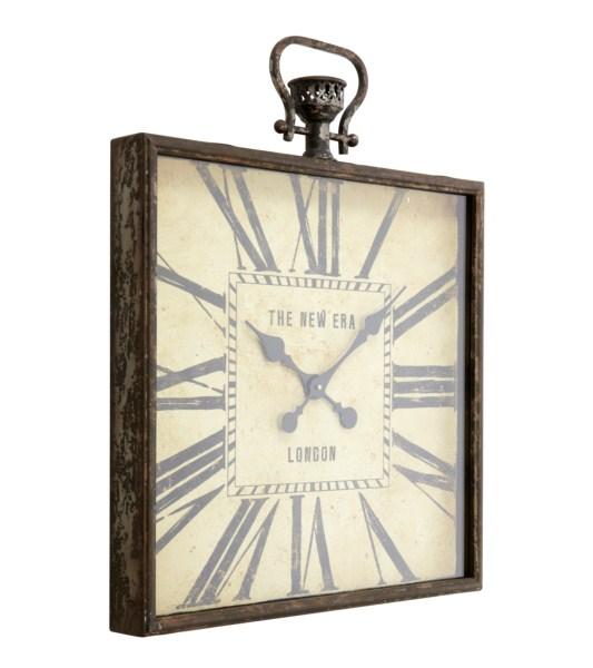 Kvadratisk vintage ur i flot patineret sortmalet metal med lidt rust og bøjle foroven. Urskiven er i gulnet og med romertal for at understrege den rustikke retro stil