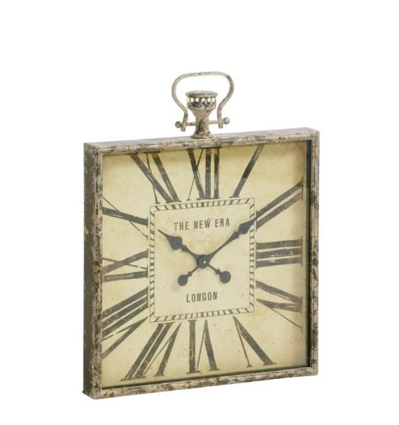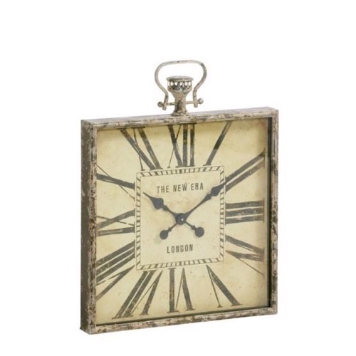 Kvadratisk vintage ur i flot patineret hvidgrønt metal med lidt rust og bøjle foroven. Urskiven er i gulnet og med romertal for at understrege den rustikke retro stil