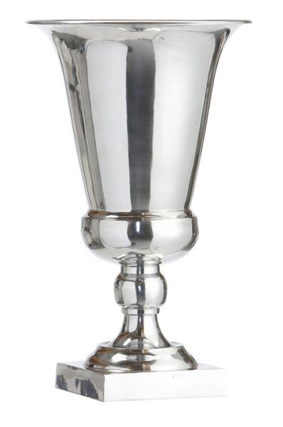 Majestætisk står denne store pokal-lignende vase i blankpoleret aluminium